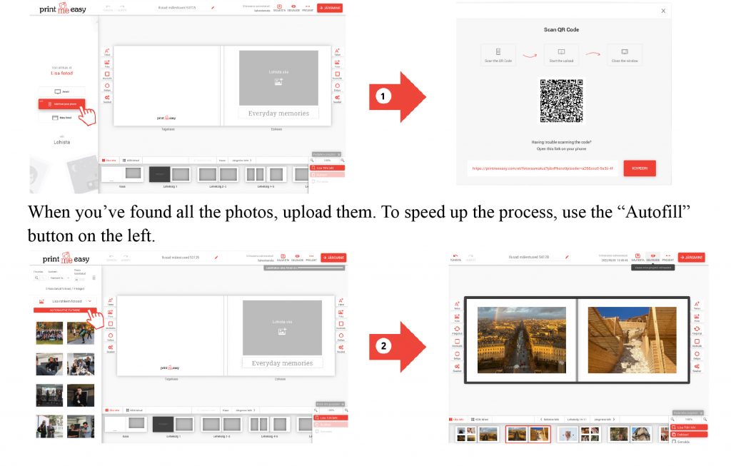 Every templates minimum amount of pages is 24 and maximum 250. You need about 25-40 photos to put together an easy photo book. Easiest way to add photos from your phone is to scan the QR-code, that appears on the computer screen and choose the suitable photos.